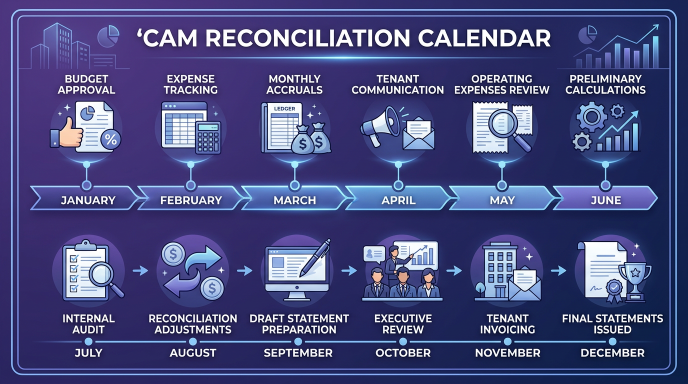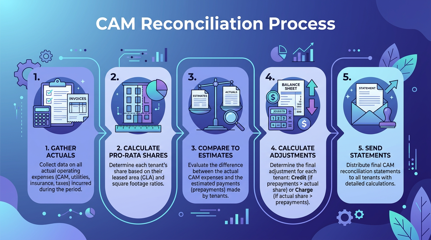 CAM reconciliation compares the estimated CAM charges billed to tenants throughout the year against the actual operating expenses incurred. The result is either a credit (tenants overpaid) or an additional charge (tenants underpaid).