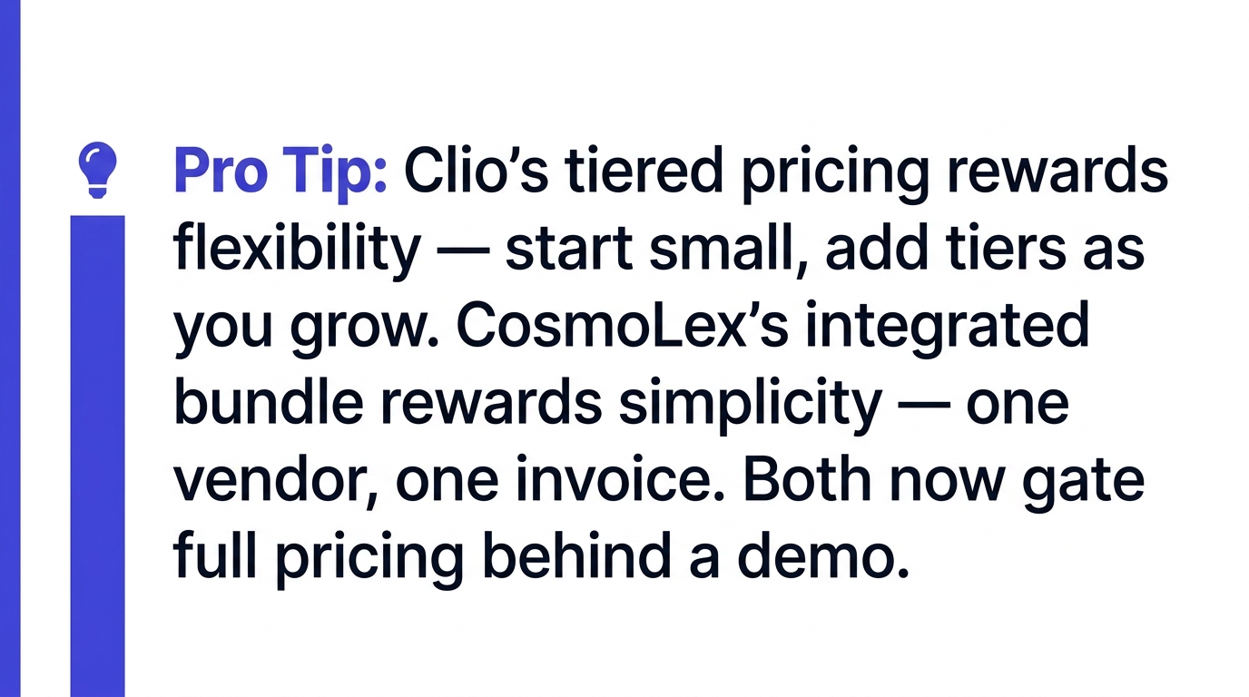 Both vendors have moved aggressively toward demo-gated pricing in the last 18 months. Clio at least publishes its Manage tier pricing; CosmoLex now requires a call for every plan. Expect add-on fees on top of both base prices: