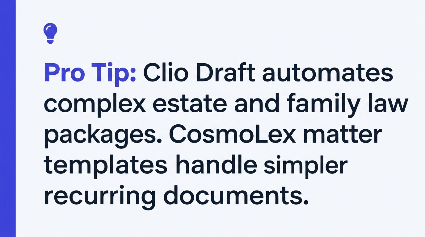 CosmoLex has matter templates, document assembly via merge fields, and workflow automation, but the depth is noticeably shallower than Clio Draft. You can create templates for common letters and basic forms, but building a 40-page estate plan from a questionnaire is not really CosmoLex's strength. CosmoLex's document management is solid for storage, versioning, and sharing — but it is not a document automation platform.