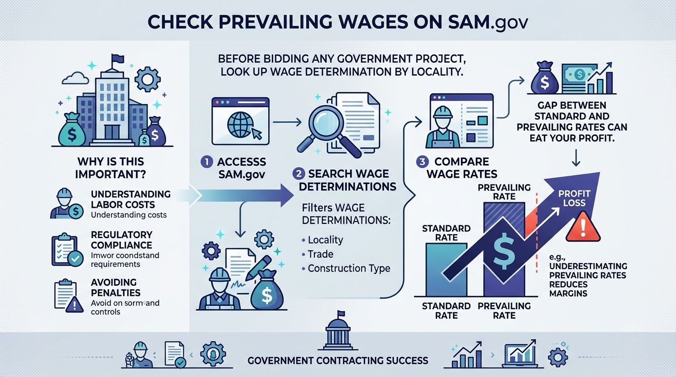 Important: Wage determinations are locality-specific and updated periodically. A project in Cook County, Illinois will have different prevailing wage rates than one in Springfield. Always verify the wage decision number listed in your contract matches the current determination on SAM.gov before starting work.