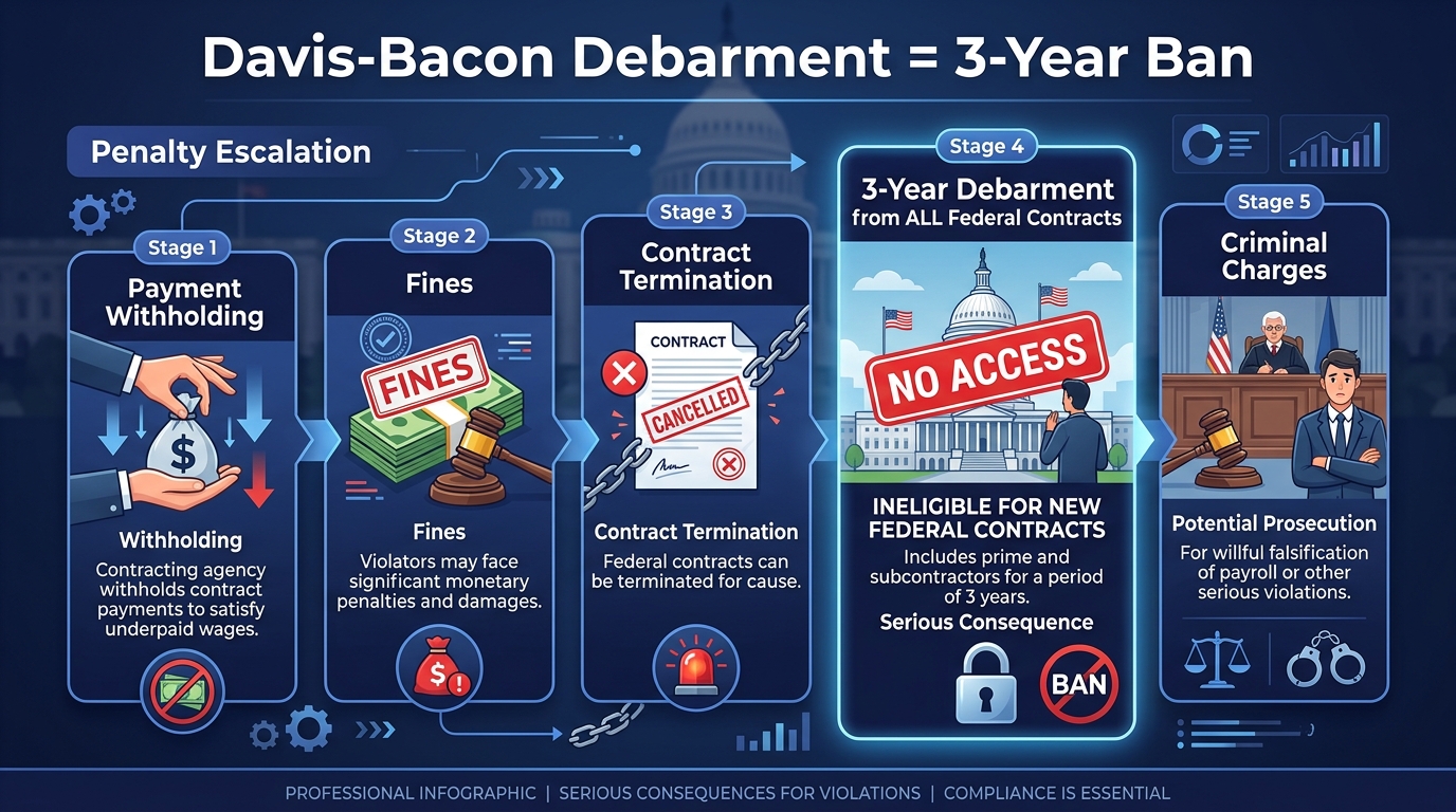 Debarment. The most severe administrative penalty: a three-year ban from all federal and federally-assisted contracts. For a contractor whose pipeline includes government work, debarment is existential.