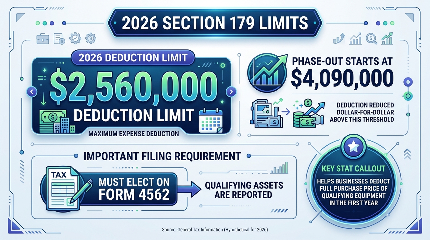 The Section 179 deduction lets you expense the full cost of qualifying equipment in the year it is placed in service — rather than capitalizing it and depreciating it over the asset’s useful life. For 2026, the numbers are:
