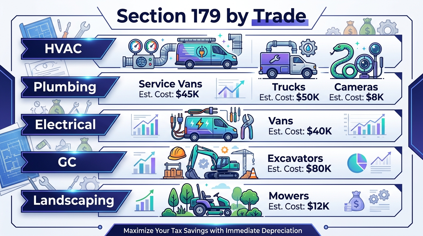 | HVAC | Service vans (over 6,000 lbs) | $45,000 | Yes — full deduction | 5 years |