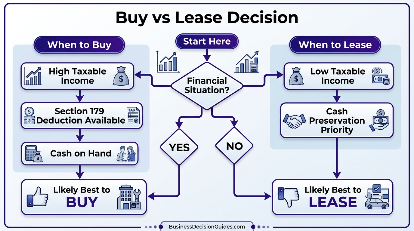 The buy vs. lease decision changes fundamentally when Section 179 is in play. Without Section 179, leasing spreads your cash outflow and gives you a predictable monthly expense. With Section 179, buying produces a massive first-year tax deduction that leasing cannot match.