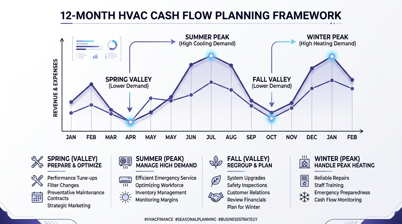 Cash flow kills more HVAC companies than bad pricing. The seasonal revenue pattern creates a structural timing mismatch that requires active management — you can’t just deposit checks and hope for the best.