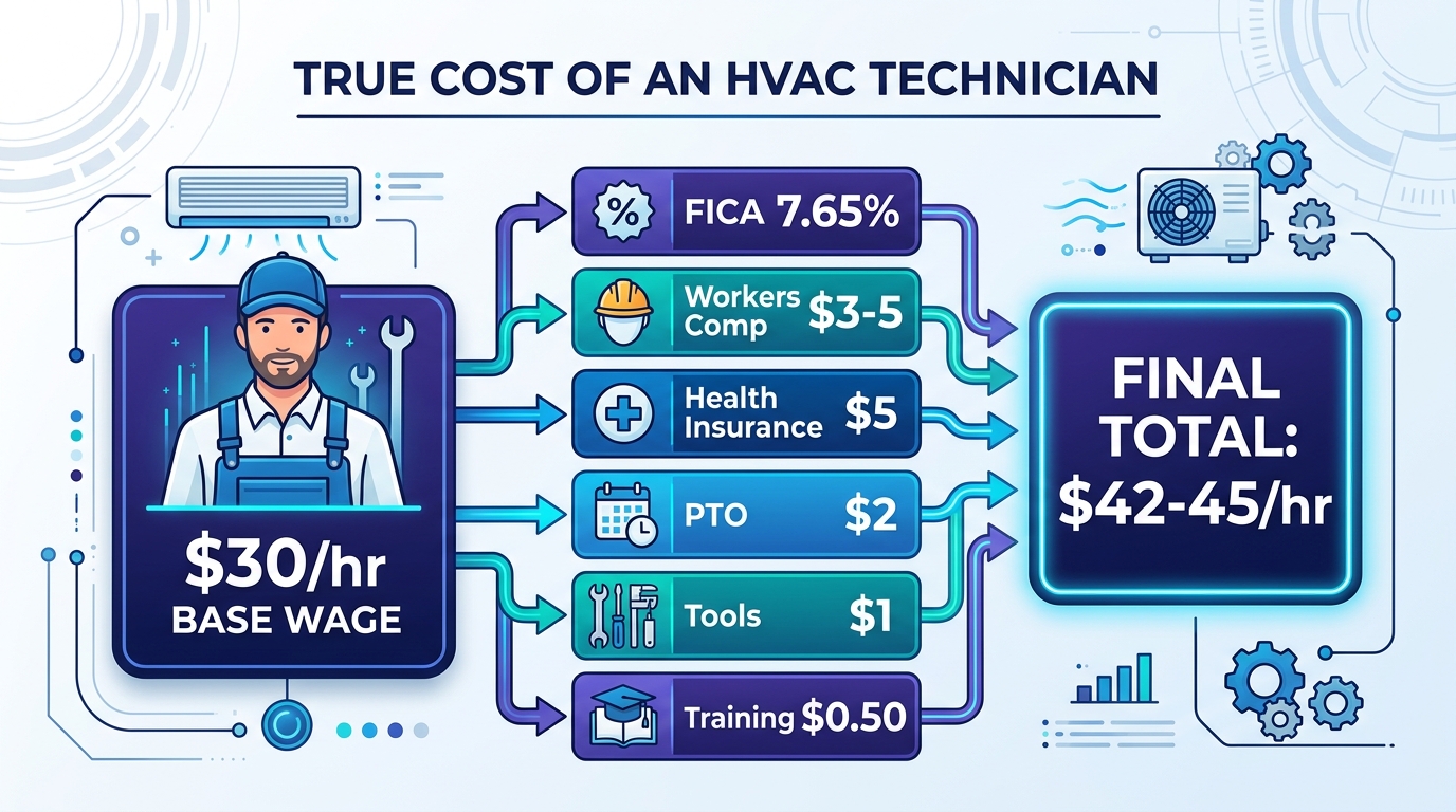 Your true cost per tech hour is $42-45 on a $30 base — a 25-40% burden rate depending on your benefits package and workers’ comp classification. If you’re costing jobs using the base wage, every margin calculation you’ve ever run is wrong.