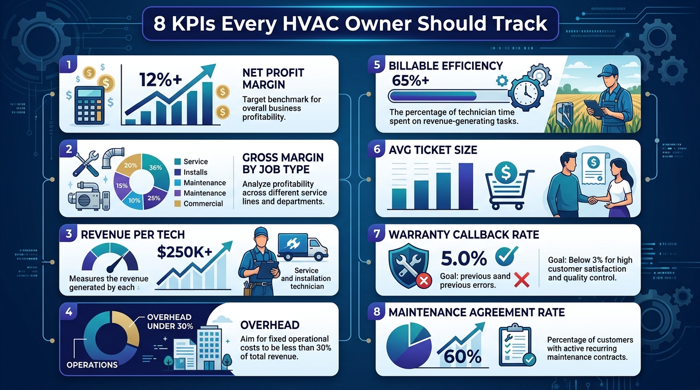 Financial KPIs tell you whether your HVAC bookkeeping is producing actionable data or just compliance paperwork. Track these monthly — not quarterly, not annually.