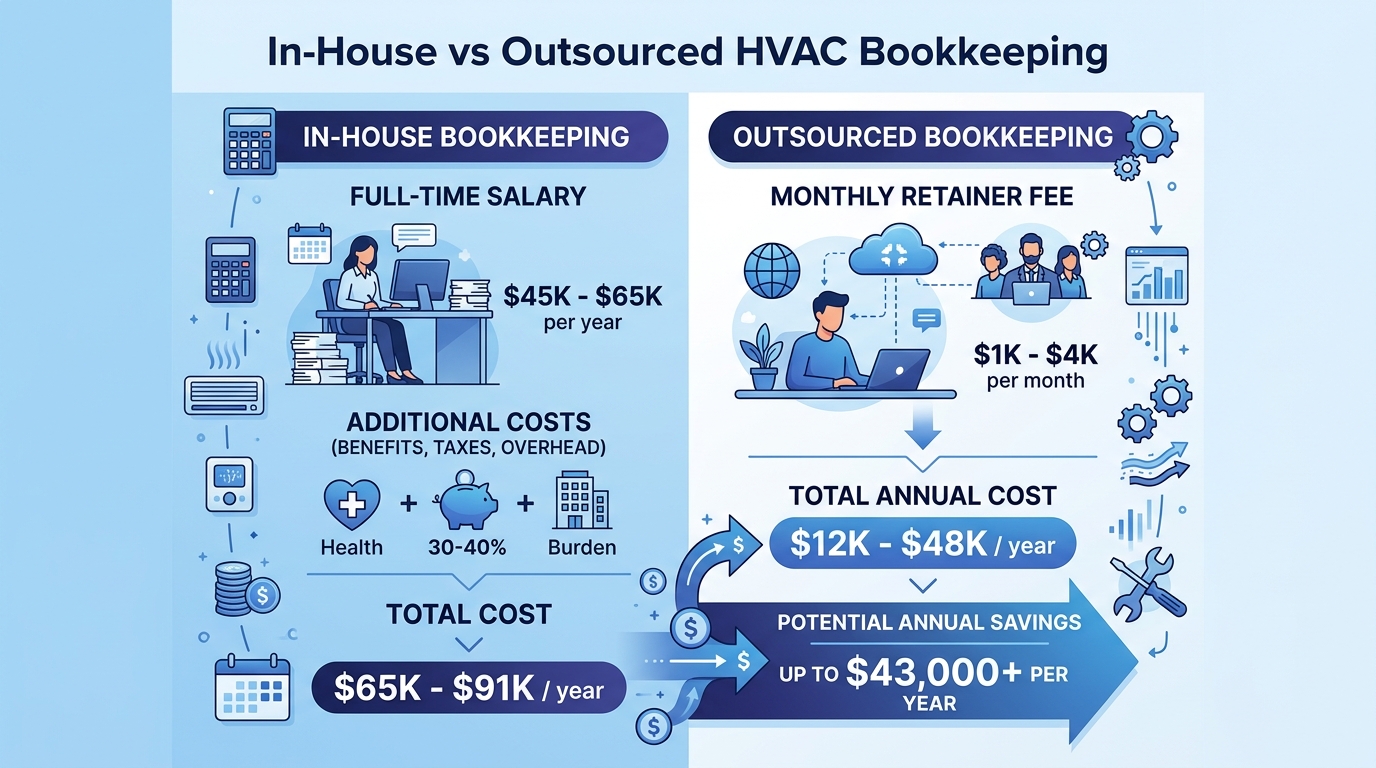 For most HVAC companies between $1M and $5M in revenue, outsourced bookkeeping runs $1,500-$3,000/month — a fraction of the fully loaded cost of a full-time hire. And you’re getting someone who already understands job costing, seasonal cash flow patterns, and technician payroll rules. No training period, no learning curve on HVAC-specific financial management.