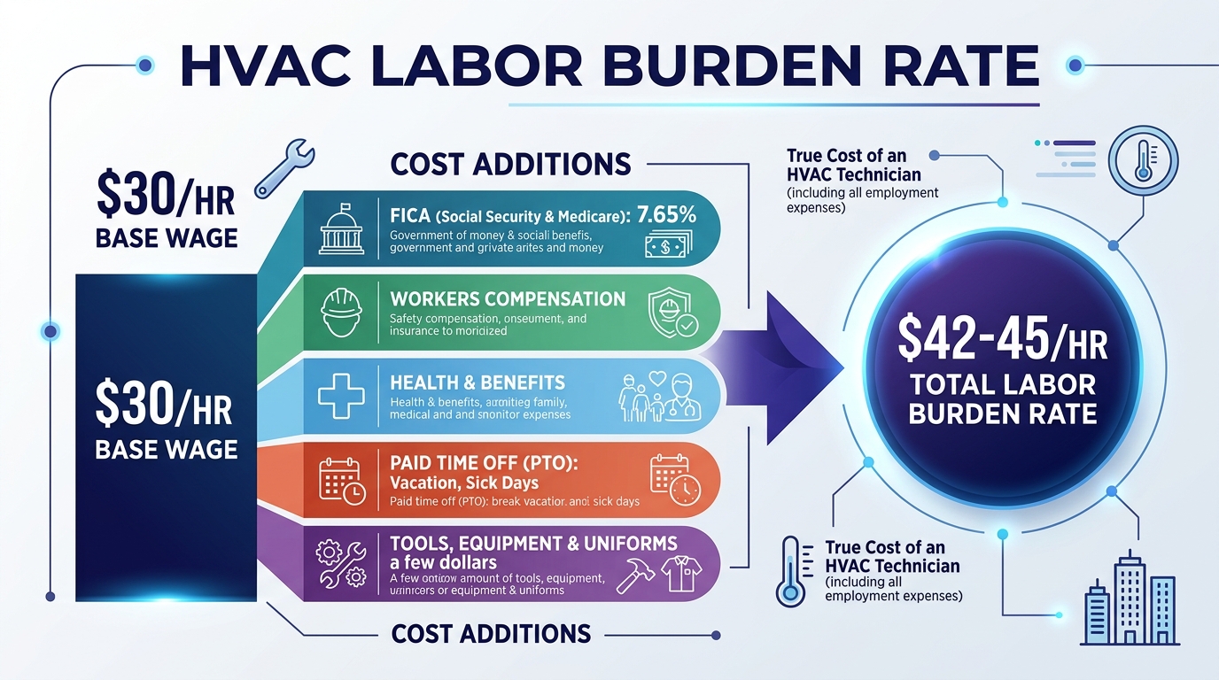 The burden multiplier lands between 1.35x and 1.48x the base wage, depending on your benefits package and your state’s workers’ comp rates. HVAC workers’ comp is expensive — the Bureau of Labor Statistics classifies HVAC installation and repair as a physically demanding trade, and insurers price accordingly.