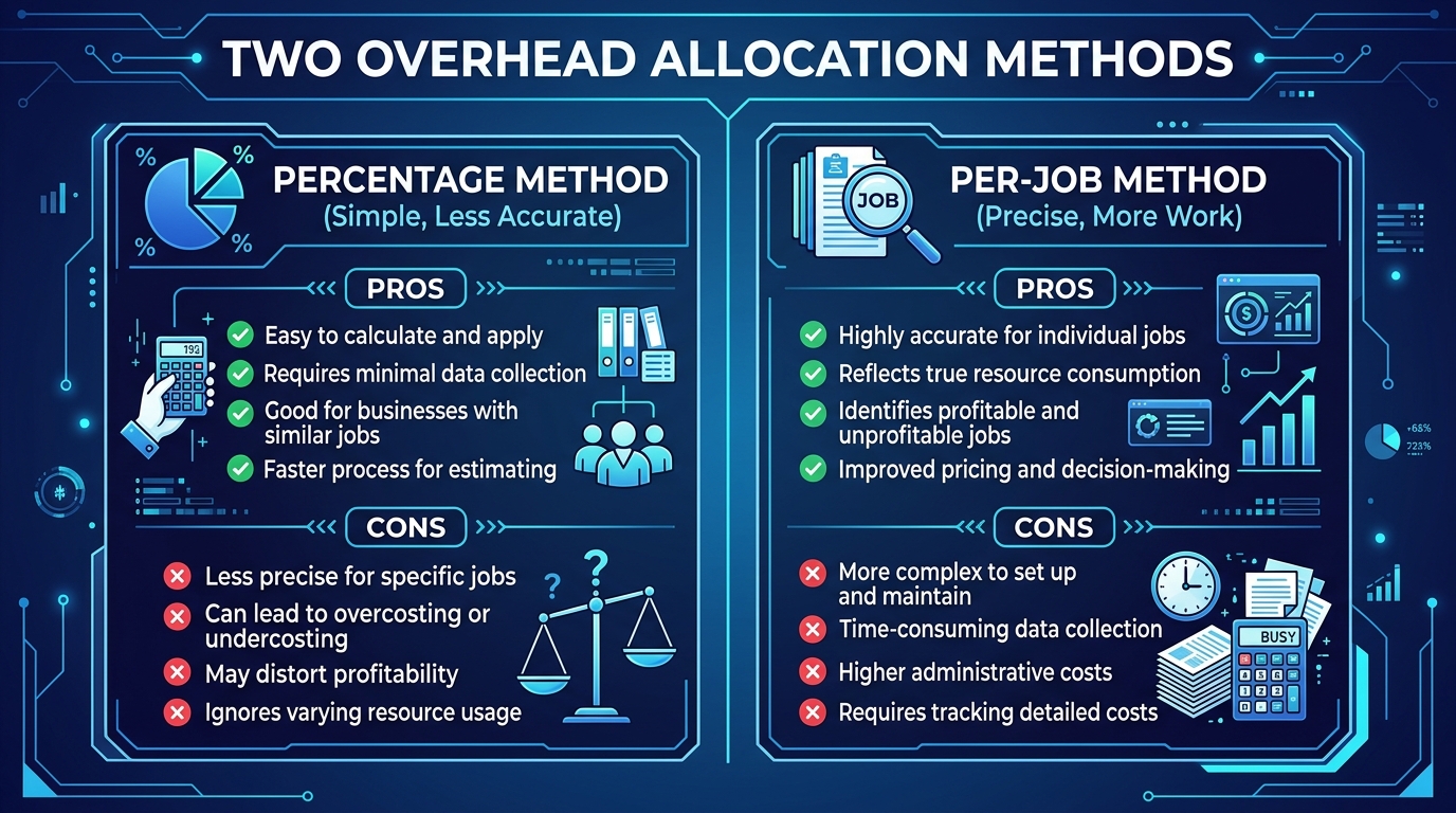 Our recommendation: Use the percentage method at 12% of revenue as your starting point. It is simpler to implement in QuickBooks and accurate enough for most HVAC contractors between $1M and $5M. Above $5M, consider switching to activity-based costing where you allocate overhead by the actual resources each job consumes.