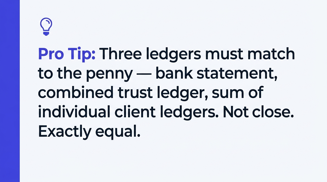 All three numbers must match. Not approximately. Not "close enough." Exactly. If the bank says $142,317.44, your combined trust ledger must show $142,317.44, and the sum of every individual client ledger must equal $142,317.44.