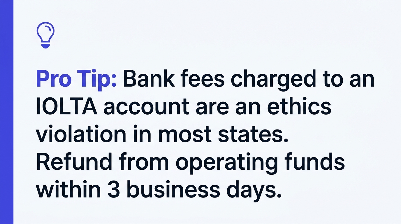 1. Bank fees charged against the trust account. This is the single most common violation. The bank charges a wire fee, a returned-check fee, or a monthly service charge, and the fee hits the IOLTA account. Attorney money — even a few dollars — cannot remain in the IOLTA account. Most state bars require the firm to replenish the shortfall from operating funds within a very short window (commonly within three business days, though specifics vary by jurisdiction). The underlying banking arrangement should have fees billed to the operating account, not the trust account.