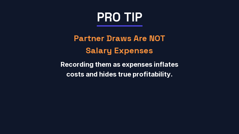 | Partner Equity | Partner Draws, Partner Contributions, Retained Earnings | Draws recorded as expenses (distorts the P&L) |