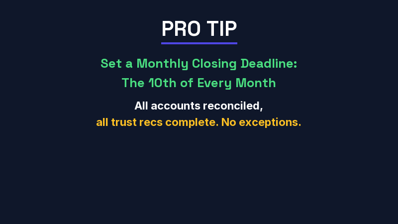 Define a monthly closing deadline (we recommend the 10th of the following month). By that date, all accounts should be reconciled, all transactions categorized, and all trust reconciliations complete. Assign a specific person (or firm) responsible for each step.