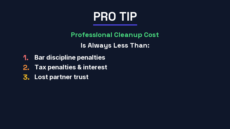 | Critical (12+ months behind) | Multiple years unreconciled, bar inquiries, possible trust shortfalls, prior bookkeeper gone | 100-200+ hours | Hire a professional immediately |