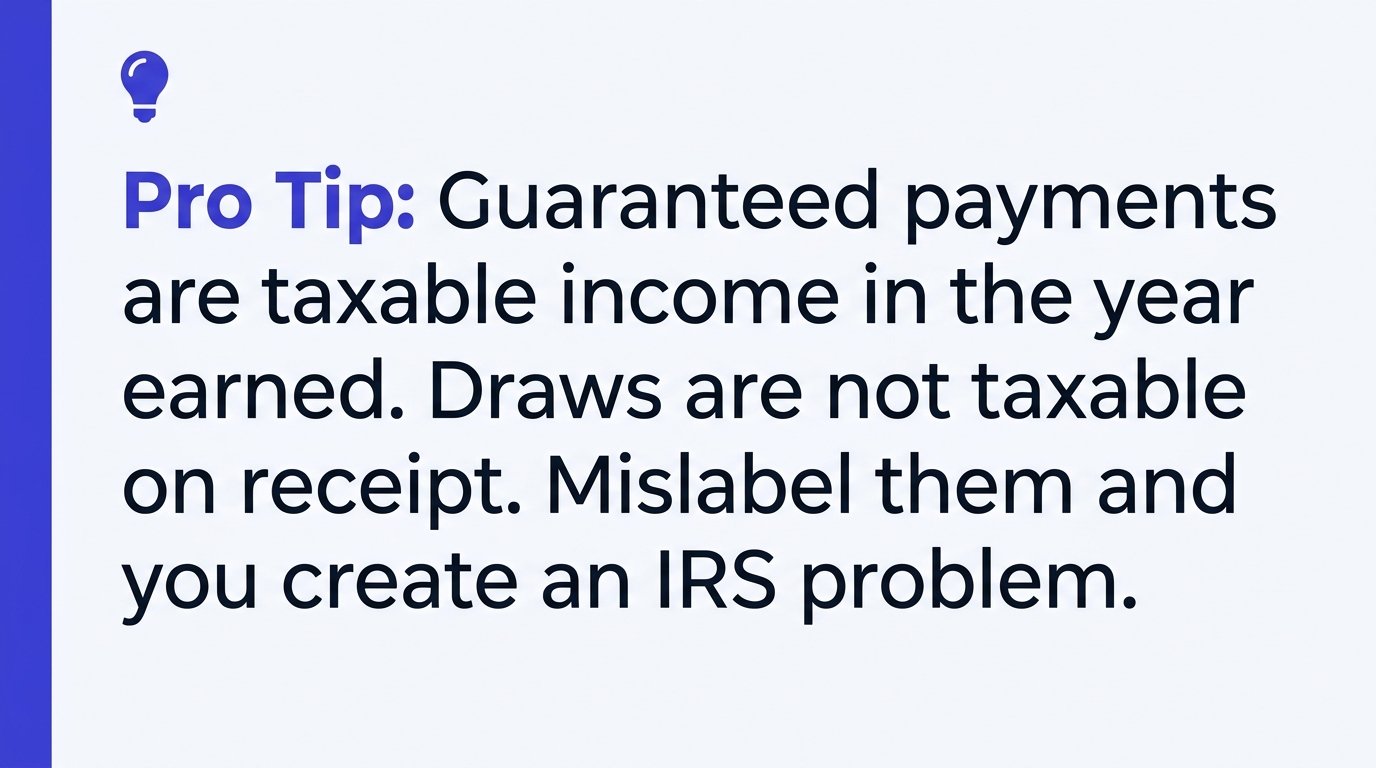 Tax warning: Guaranteed payments are taxable in the partner's tax year that includes the end of the partnership's tax year in which they were deducted — regardless of when the cash was actually paid. If your firm accrues a December guaranteed payment but doesn't pay it until February, the partner still owes tax on it for the prior year.