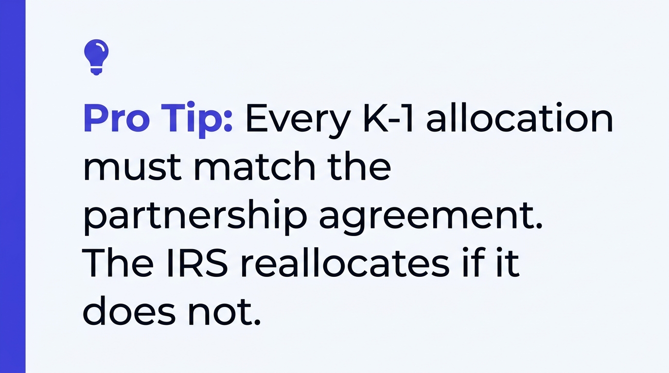 The IRS's Partner's Instructions for Schedule K-1 (Form 1065) lays out exactly how each of these should be reported. If your firm's K-1s don't match the partnership agreement's allocation provisions, you have a problem — and it's a problem that compounds every year it goes unfixed.
