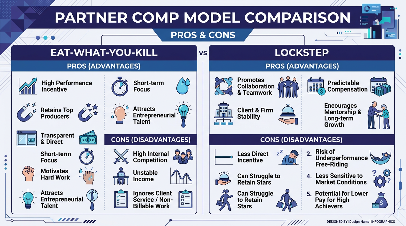 Lockstep ties compensation to tenure. A partner at year five earns a defined percentage, a partner at year ten earns more, and so on. This model is common in large firms with institutional clients where no single partner “owns” the relationship. It rewards loyalty and reduces internal competition but can frustrate high-performing junior partners.