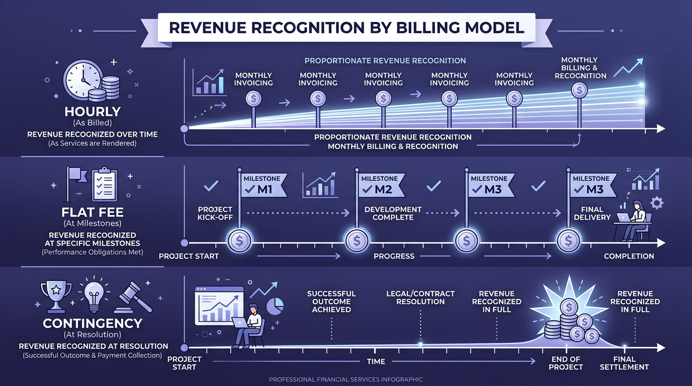 Each billing model follows different revenue recognition rules, and getting them wrong can trigger IRS scrutiny and state bar issues.