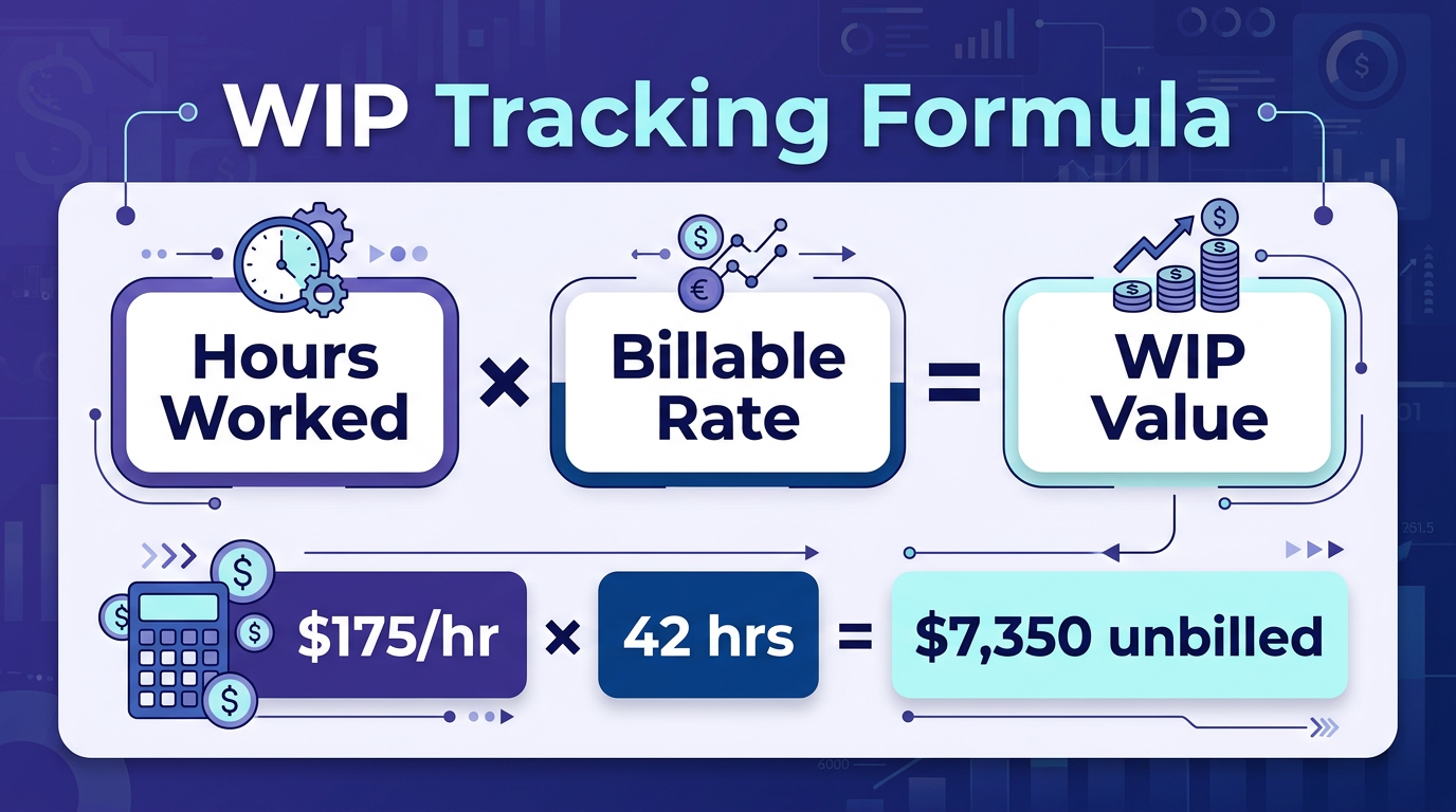 Flat fee billing: No WIP exists. But track hours internally as “shadow WIP” for profitability analysis. If your flat fee formations average 14 hours at $3,500, your effective rate is $250/hour. If hours creep to 20, that drops to $175/hour.
