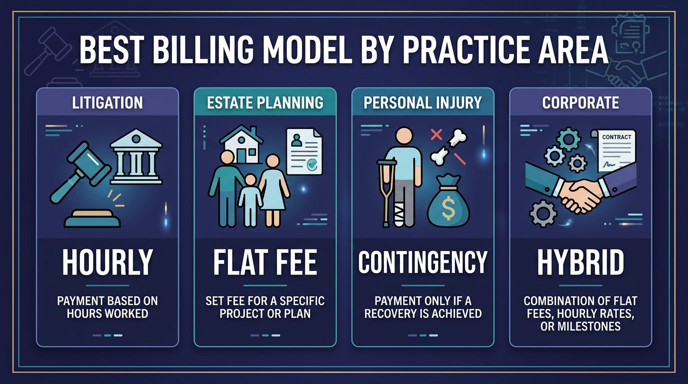 Best fit for hybrid: Family law (flat fee for uncontested, hourly for contested), IP portfolios (flat fee filings, hourly opposition), and corporate clients with both transactional and advisory needs.