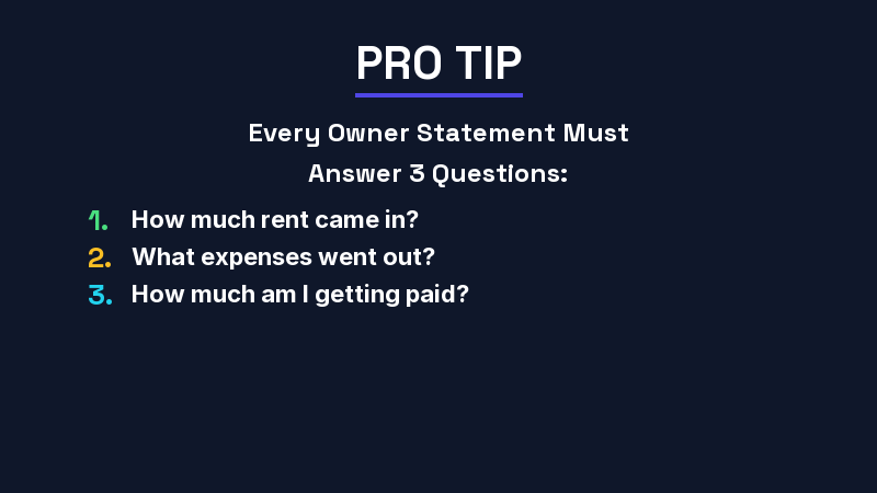 Your statement should answer three questions at a glance: How much rent came in? What expenses went out? How much am I getting paid?