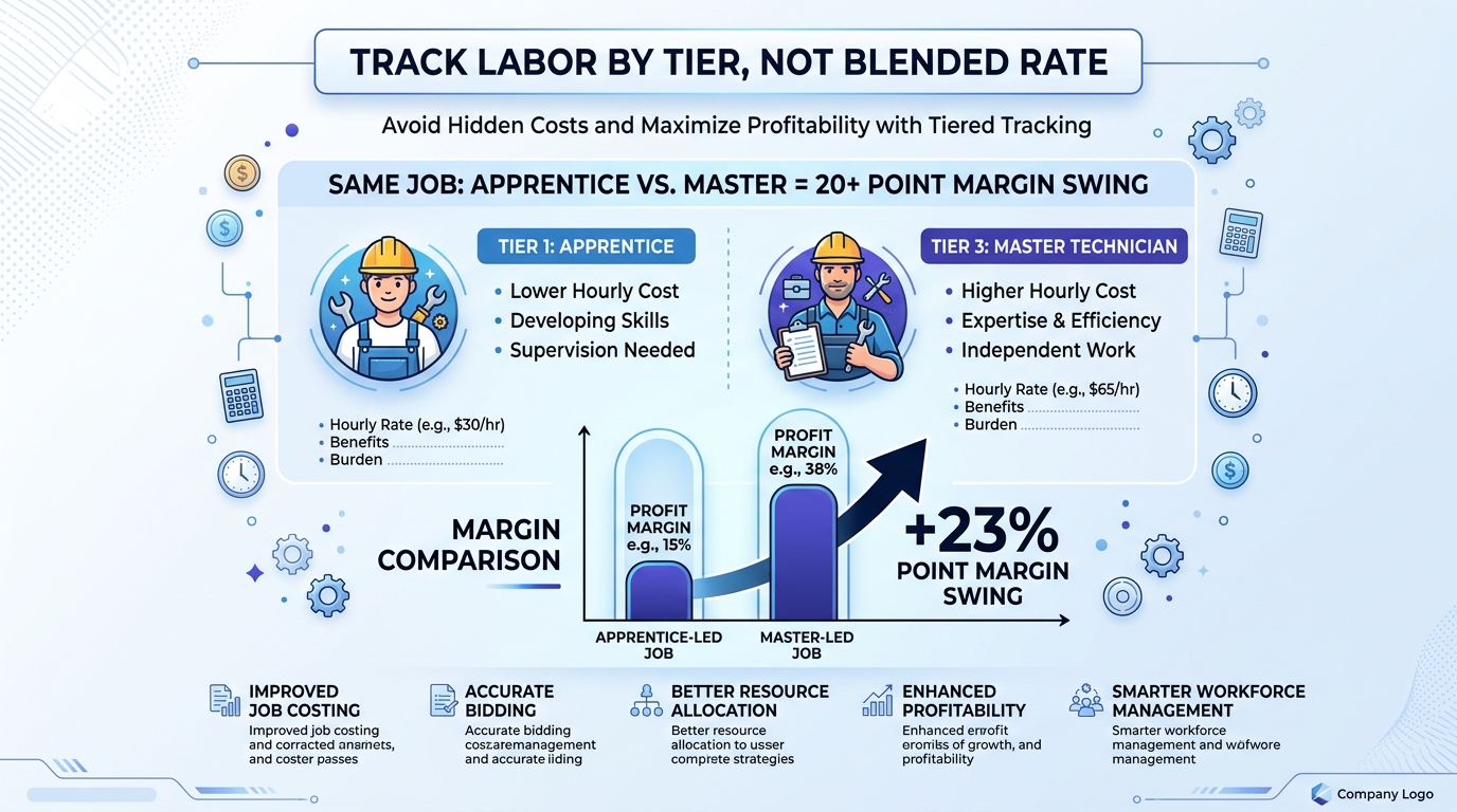 When your techs log hours against a job, they select the correct labor tier. This flows the actual labor cost to the project, not an average. If your field service platform (ServiceTitan, Housecall Pro, FieldEdge) syncs with QuickBooks, map the technician tiers in the integration settings so it happens automatically.