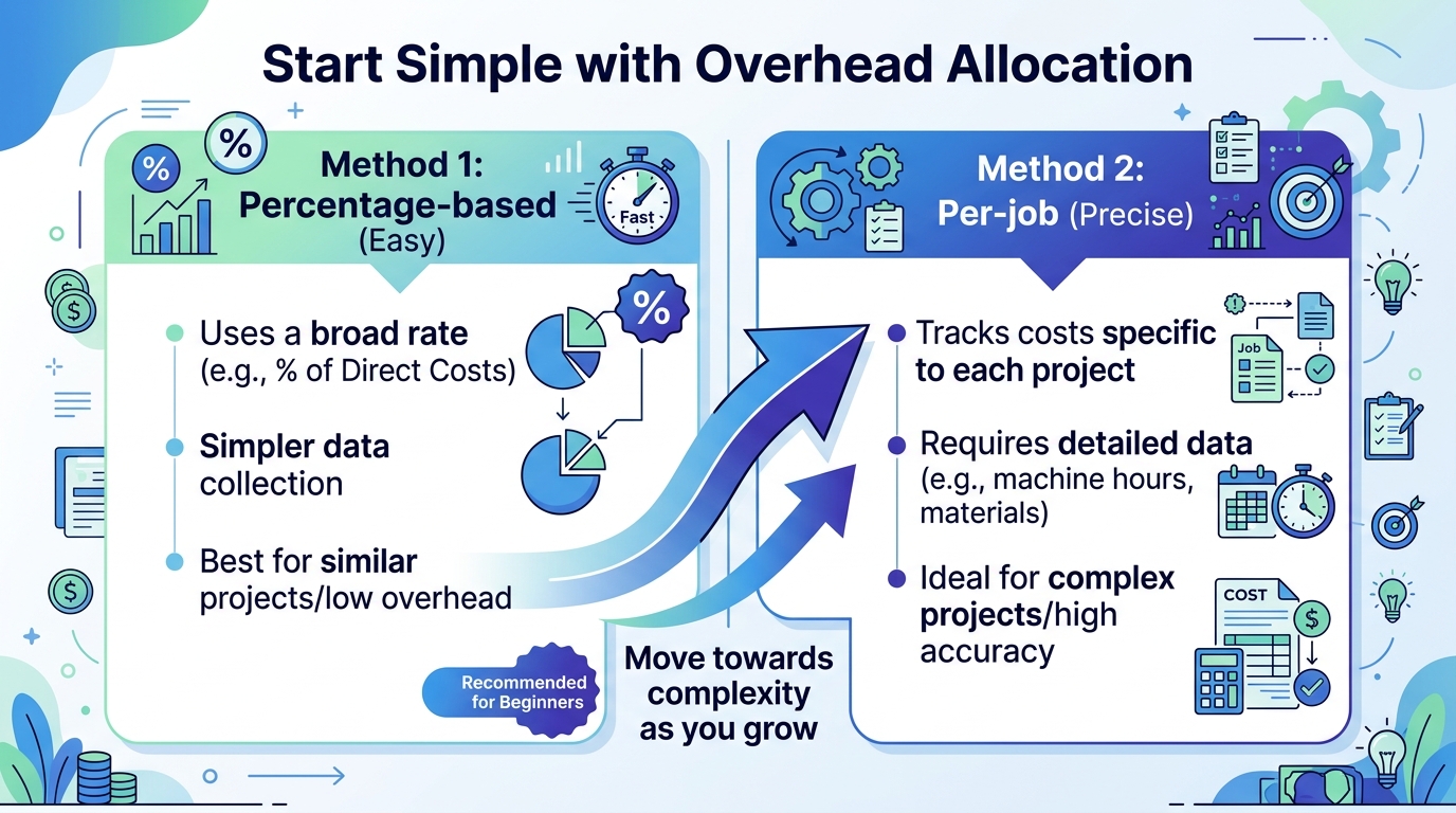 Our recommendation for most plumbing contractors between $1M-$5M: Start with percentage-based allocation. It’s better than no allocation. Once your bookkeeping system is tracking labor-hours per job reliably, graduate to per-job allocation for a more accurate picture.