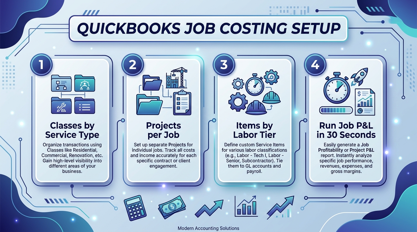 If your current QuickBooks setup wasn’t built for job costing, it’s worth rebuilding the chart of accounts and project structure now. The cost of a one-time setup is trivial compared to running another year with margin data you can’t trust.