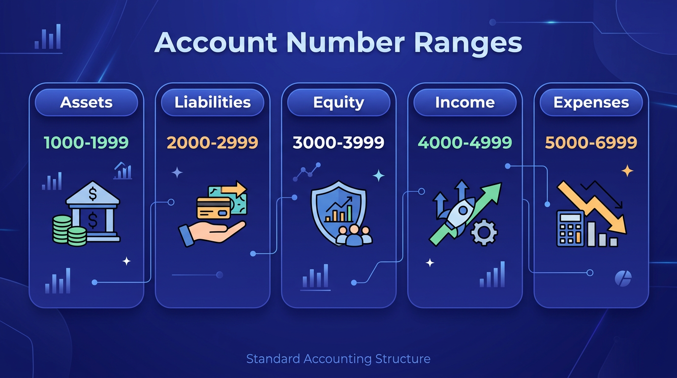 Why numbered accounts matter: QuickBooks Online sorts accounts alphabetically by default. Without a numbering system, “Advertising” appears next to “Association Dues” instead of grouping logically by function. A numbered structure (1000s for assets, 4000s for income, 5000s for direct costs) keeps your chart organized as it grows from 30 accounts to 150+.