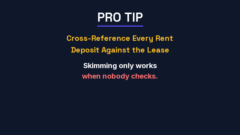| Rent skimming | Portion of collected rent pocketed before deposit | Deposits consistently less than lease amounts; cash-only tenants; unexplained vacancies | Online-only rent collection; monthly bank reconciliation against lease schedules |