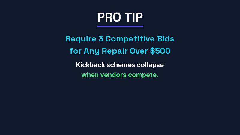 Your maintenance coordinator steers all plumbing work to their cousin's company at inflated rates. The vendor invoices $800 for a job that should cost $400, and kicks back $200 to your employee. You're paying market rate (or so you think), owners are absorbing the cost, and nobody questions it because the invoices look legitimate.