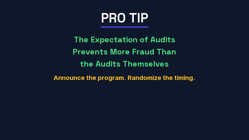 Pick a random month each quarter and do a deep-dive review: pull 10 vendor payments, verify the work was completed, check pricing against market rates, confirm the vendor exists. The expectation of audits deters fraud more than the audits themselves.