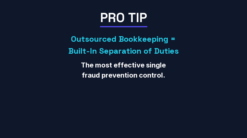 The strongest fraud prevention control is also the simplest: have someone independent handle your money. When your bookkeeping is handled by an outsourced team, you get built-in separation of duties that's nearly impossible to achieve with a small in-house staff.