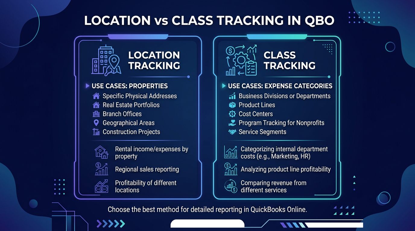 QuickBooks Online offers two built-in segmentation tools — Location tracking and Class tracking — and choosing the right one (or using both) depends entirely on your portfolio structure.