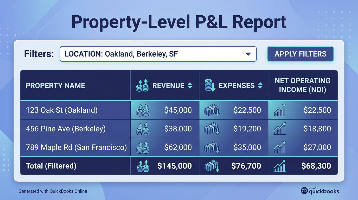 Once transactions are flowing with Location and Class tags, pulling property-level financials takes about 30 seconds.
