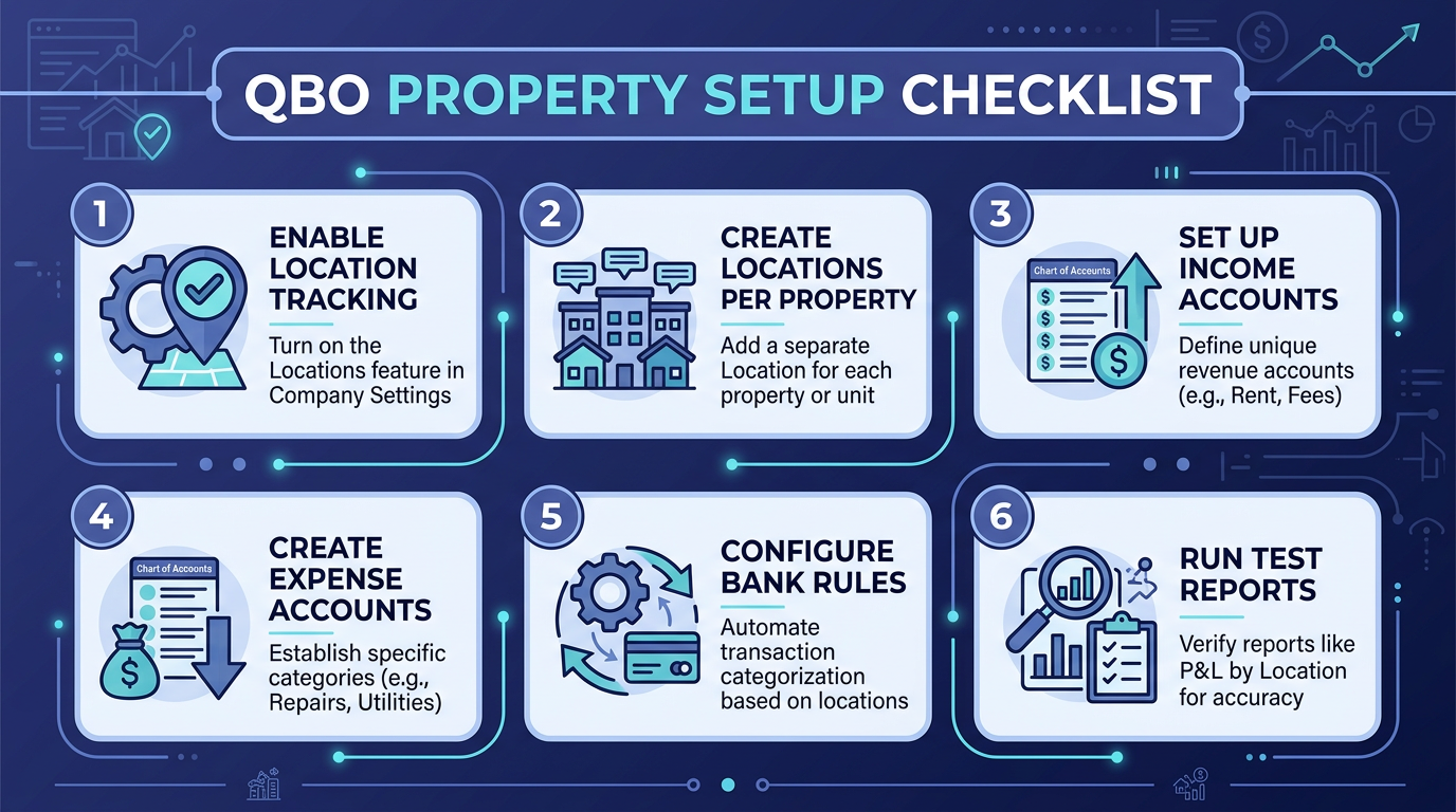 For most property managers, the P&L by Location report is the daily driver. Run it monthly, compare against budget, and flag any property where operating expenses exceed 40–45% of gross rental income. If you need help with the initial QBO configuration, our QuickBooks Online setup guide covers the fundamentals.