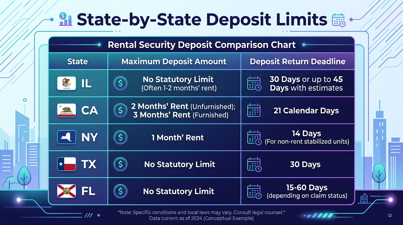 | State | Max Deposit | Trust Account Required | Interest Required | Return Deadline | Penalties for Non-Compliance |