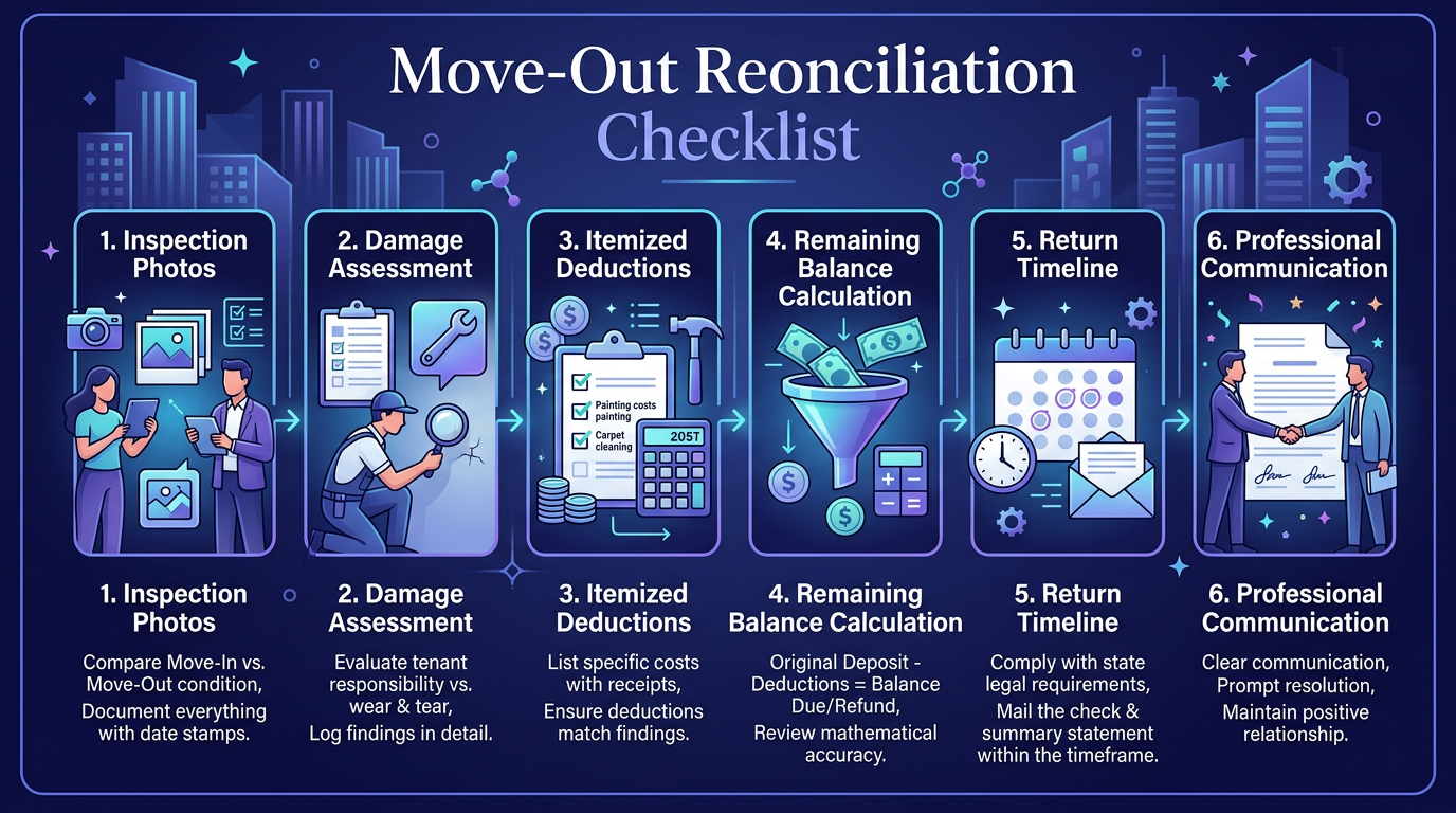 Move-out accounting is where security deposit management gets complicated. When a tenant vacates, you need to inspect the unit, document any damages beyond normal wear and tear, calculate deductions, and return the remaining balance — all within your state’s statutory deadline.