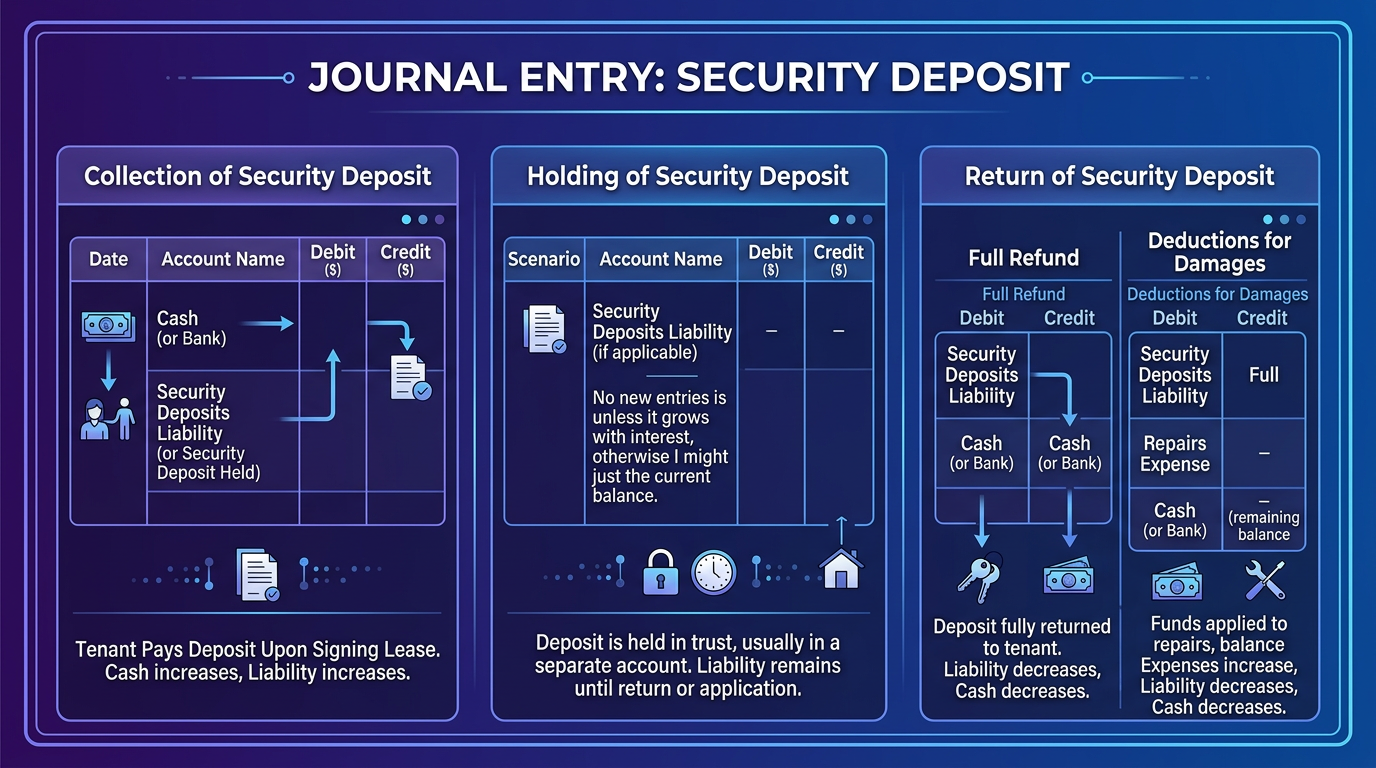 Important: Security deposits must be recorded as liabilities from the day they are received. Recognizing deposit funds as revenue — even temporarily — violates GAAP and most state landlord-tenant statutes.